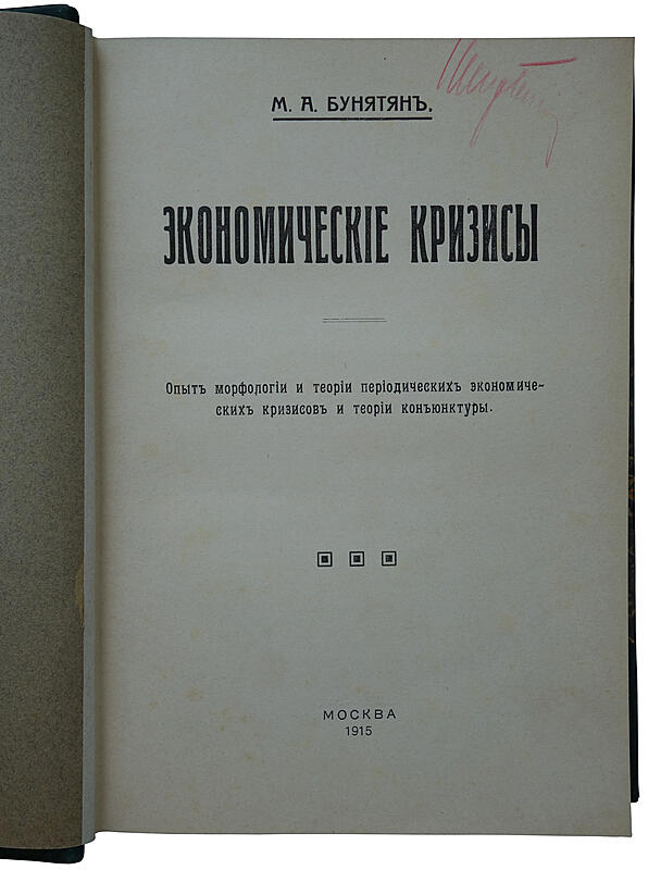 Антикварная книга "Экономические кризисы" Бунятян М.А. ОПИСАНИЕ Опыт морфологии и теории периодических экономических кризисов и теории конъюнктуры. Ментор Абрамович Бунятян (1877 — 1969) — немецкий и французский экономист, деятель русской и армянской эмиграции.