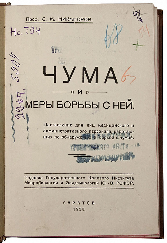 Никаноров С.М. Чума и меры борьбы с ней (Антикварная книга 1928г.) ОПИСАНИЕ Наставление для лиц медицинского и административного персонала, работающих по обнаружению и борьбе с чумой. Редкое провинциальное издание. Издание обобщает опыт работы автора, который в течение 14 лет непрерывной работы наблюдал более пятидесяти чумных вспышек в качестве лабораторного работника, врача и даже санитара, наблюдателя-исследователя и, наконец, в роли организатора и руководителя всеми противочумными мероприятиям Юго-востока России. Представленное «Наставление» предлагалось в качестве обязательной инструкции для соответствующих лиц и учреждений, поскольку обозревает все достижения профилактики и борьбы с чумой, а также предлагает некоторые новаторские подходы. Автор — Сергей Михайлович Никаноров (1885-1937) — директор института «Микроб» в Саратове. Репрессирован в 1937 г., после чего его издания изымались.
