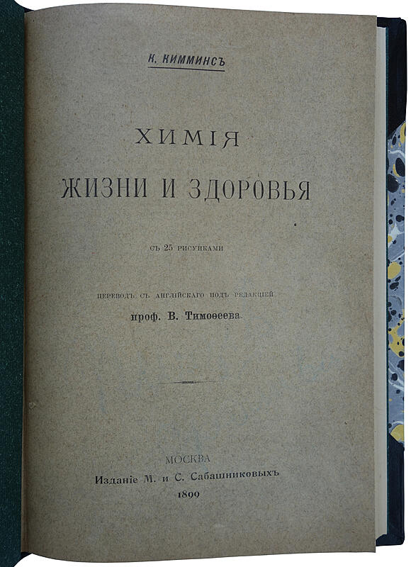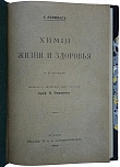 Антикварная книга "Химия жизни и здоровья" Кимминс К. ОПИСАНИЕ С 25 рисунками. Перевод с английского под редакцией проф. В. Тимофеева. Оглавление: Глава 1. Основные понятия химии Глава 2. Атмосфера Глава 3. Углерод и его соединения Глава 4. Дыхание Глава 5. Вентиляция Глава 6. Вода Глава 7. Распространение заболеваний благодаря нечистой воде. Бактерии. Глава 8. Пищеварение Глава 9. Хлеб и мясо, как пищевые вещества Глава 10. Молоко, чай, спирт, как пищевые вещества.