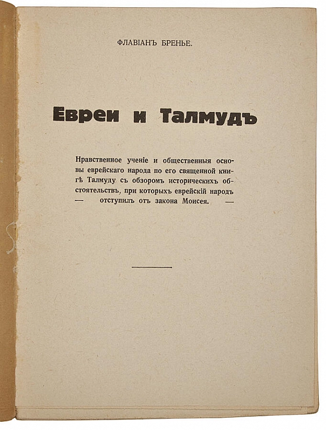 Флавиан Бренье. Евреи и Талмуд (Антикварная книга 1928г.) ОПИСАНИЕ Перевод с французского графа Дм. Мих. Граббе. Неразрезанный экземпляр. Известное издание по «еврейскому вопросу». Напечатано в крайне правом эмигрантском издательстве «Долой зло». Издательство публиковало резко-антисемитские, антибольшевистские тексты, разжигало межнациональную рознь. Стоит заметить, что идеи заговора жидомасонов распространялись не только в фашистских режимах Германии и Испании, но и в среде русских эмигрантов во Франции до войны. На основе этой работы в послевоенной Аргентине была написана и издана книга В. Мокшанского «Сущность еврейского вопроса». Экземпляры данного издания в отличном состоянии редки.