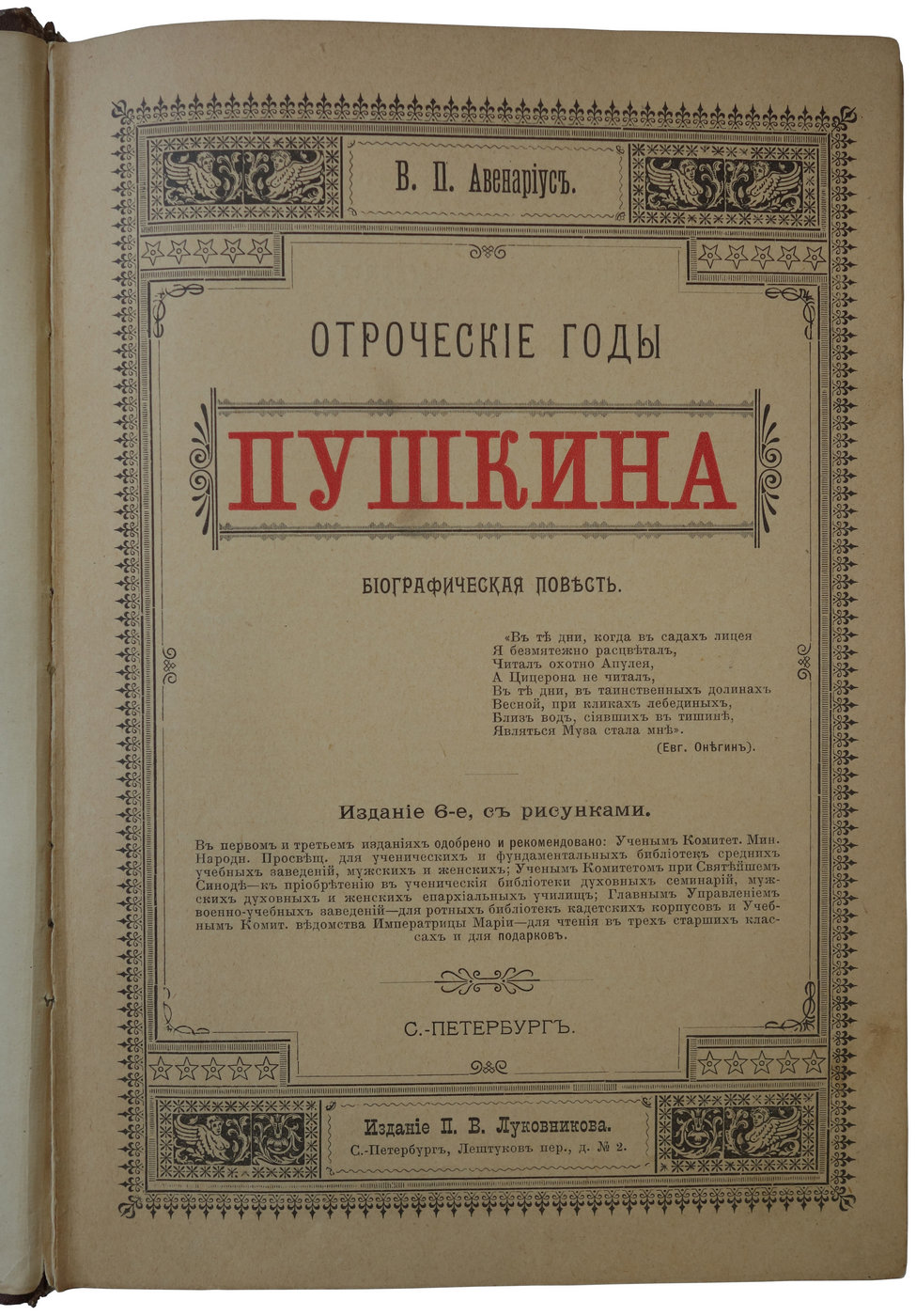 Серия очерков В. П. Авенариуса о различных этапах жизни русских классиков «Золотого века» является важным вкладом в русскую литературу. Одним из наиболее значимых произведений этой серии является книга «Отроческие годы Пушкина», в которой с большой живостью и детализацией описаны ранние годы великого русского поэта. Это произведение не только представляет интерес с точки зрения биографической литературы, но и позволяет глубже понять формирование личности и творческого потенциала Александра Сергеевича Пушкина.