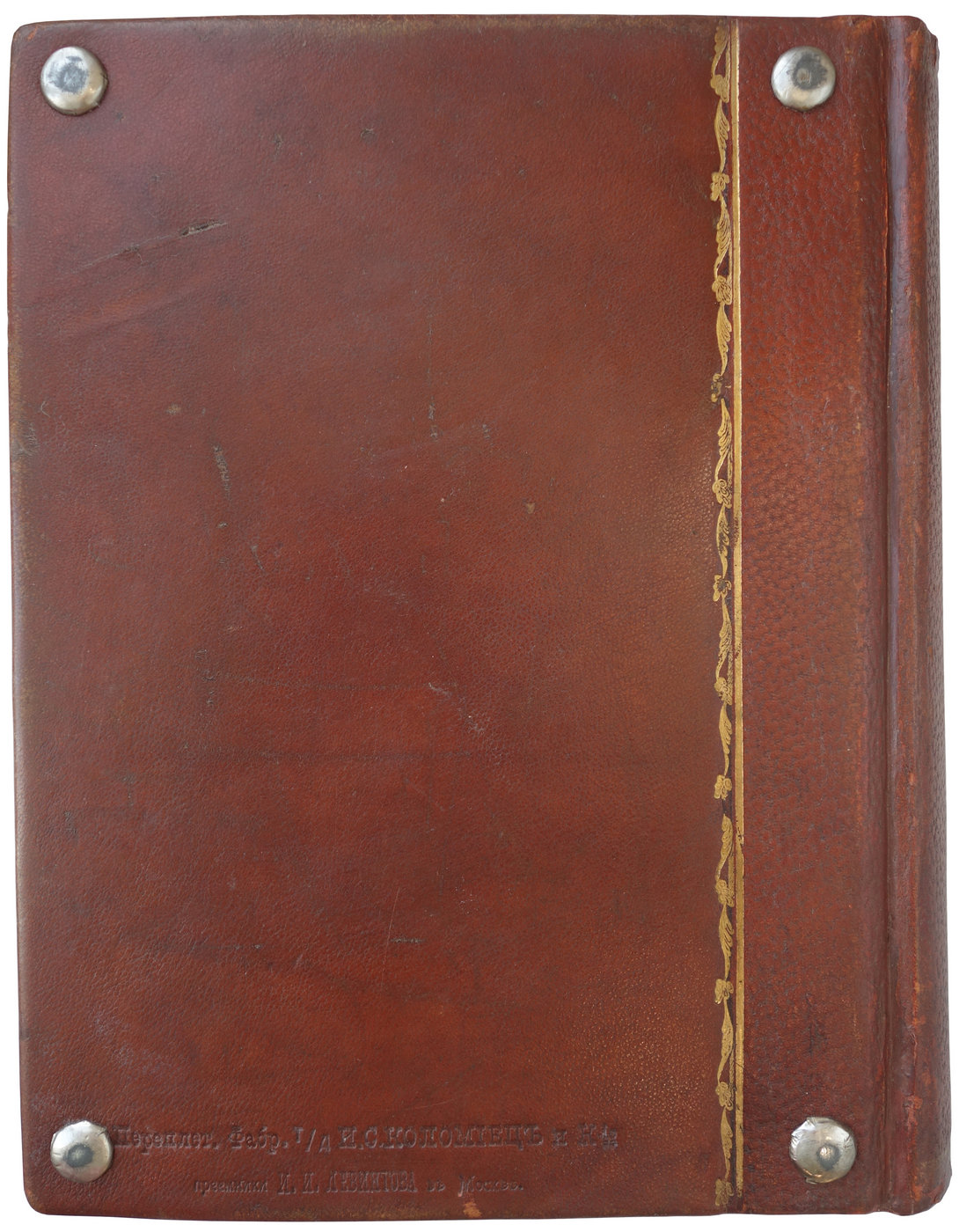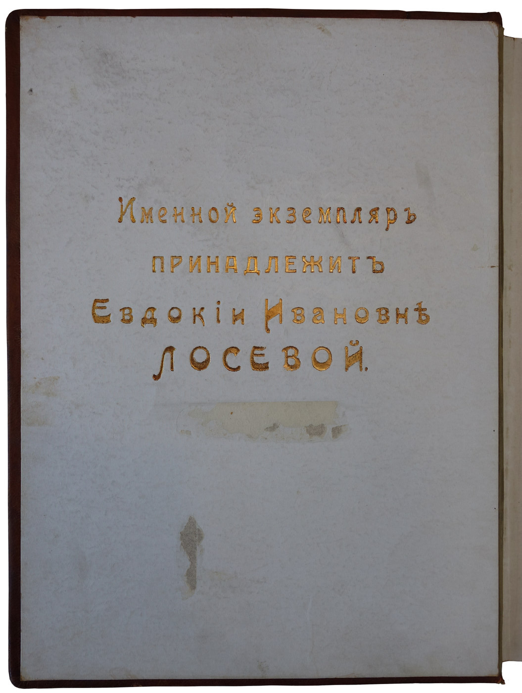 На форзаце золотым тиснением надпись: «Именной экземпляр / принадлежит / Евдокии Ивановне / Лосевой».