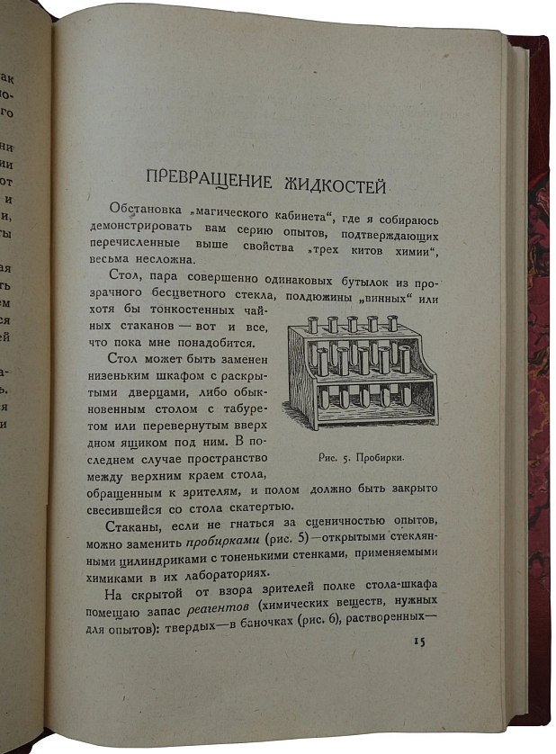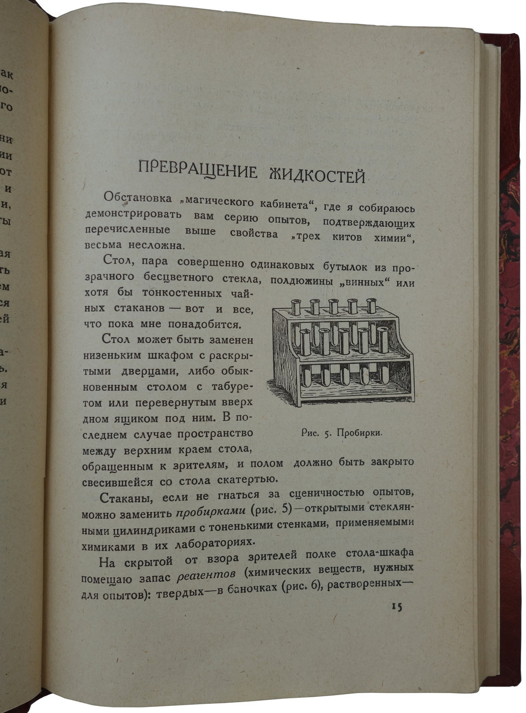 В книге содержатся описания химических опытов и фокусов, правила безопасности при их подготовке и осуществлении, а также правила поведения при возникновении несчастных случаев. Примеры опытов: "Газ тухлых яиц", "Молоко из воды", "Вода из радуги", "Превращение воды в кровь", "Золото, растворимое и растворенное", "Вода из огня", "Очистить яйцо, не разбив скорлупы" и др.