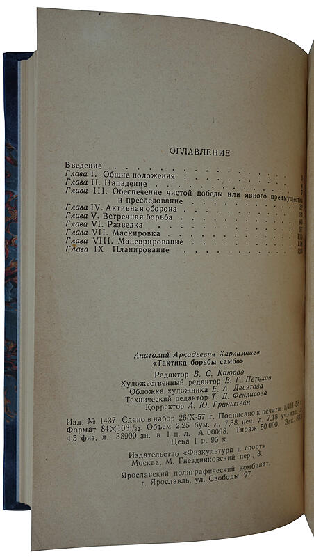 Антикварная книга "Тактика борьбы Самбо" Харлампиев А.А. 1958 г. ОПИСАНИЕ Эта книга является продолжением написанного учебного пособия по борьбе самбо для секций низовых коллективов и создана с целью помочь самбистам старших разрядов повысить свое спортивное мастерство. Однако тактика самбо является таким предметом, который может заинтересовать и представителей других видов борьбы Анатолий Аркадьевич Харлампиев (1906 — 1979) — исследователь боевых искусств мира и национальных видов борьбы народов СССР, один из создателей борьбы самбо. Заслуженный мастер спорта СССР, заслуженный тренер СССР. Отличник физической культуры (1947). С начала 1920-х годов Харлампиев собирал и систематизировал народные игры, содержащие приёмы борьбы, а с 1934 года — описывал и классифицировал спортивные и боевые приёмы. В 1941 году он ушёл на фронт, а, вернувшись, продолжил заниматься спортом. В 1947 году принял участие в первом послевоенном Чемпионате по самбо, а в 1949-м выпустил книгу, посвящённую этому виду спорта.