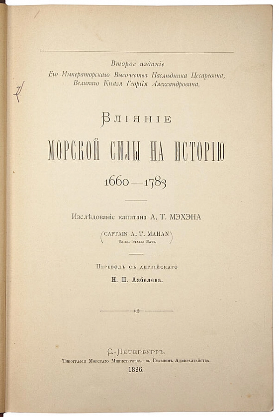Влияние морской силы на историю 1660–1783 (Антикварная книга 1896г.) ОПИСАНИЕ Второе издание Его Императорского Высочества Наследника Цесаревича, Великого Князя Георгия Александровича. Исследование капитана А.Т. Мэхэна. Перевод с английского Н.П. Азбелева. Прижизненное издание американского военного морского теоретика и историка Альфреда Тайера Мэхэна (1840-1914). Великий князь Георгий Александрович (1871–1899) — третий сын императора Александра III и Марии Фёдоровны, младший брат Николая II. После 1894 года как первый в очереди на наследование российского престола носил титул цесаревича. В 1894 году неожиданно умер Александр III. Николай стал императором, поскольку детей у него ещё не было, наследником цесаревичем был объявлен брат императора Георгий. 28 июня 1899 года в возрасте 28 лет скоропостижно скончался от туберкулёза. Из предисловия: В своем труде «Влияние морской силы на историю 1660-1783», выпущенном в 1889 г. в США, он первым ввел в научный оборот понятия «господство на море» и «морская мощь», что впоследствии явилось основным фактором ведения морской войны. В 1892 г. вышла его книга «Влияние морской силы на Французскую Революцию и Империю (1793-1812)», в которой он дополнил и развил концепцию морской мощи государства. Первая книга только в США и Англии переиздавалась более 30 раз (вторая — более 20). Эти два фундаментальных военно-теоретических труда принесли Мэхэну мировую известность. Его причислили к выдающимся военно-морским теоретикам конца XIX — начала XX в. Мэхэн стал кумиром морских офицеров американского флота. Его портреты находятся в кабинетах флотоводцев и военачальников и более 100 лет публикуются на страницах главного военно-теоретического журнала Военно-морских сил США «United States Naval Institute Proceedings». В свое время президент США Т. Рузвельт назвал Мэхэна «великим народным слугой», обладавшим «умом первоклассного государственного деятеля». Огромной популярностью труды Мэхэна пользовались также в Англии, Германии, Франции, России и других странах. Сформулированные Мэхэном концепции оказывали влияние не только на развитие теории военно-морского искусства, но и на выработку внешней политики и морской доктрины многих морских держав мира. Германский император Вильгельм II в мае 1914 г. писал: «Я сейчас не только читаю, но пожираю книгу капитана Мэхэна и стараюсь выучить ее наизусть». Трудно найти военно-теоретический труд, который не содержал бы ссылок на работы Мэхэна.