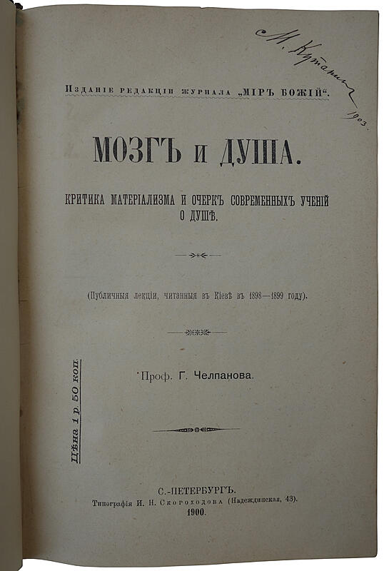Антикварная книга "Мозг и душа. Критика материализма и очерк современных учений о душе" Челпанов Г. 1900г.