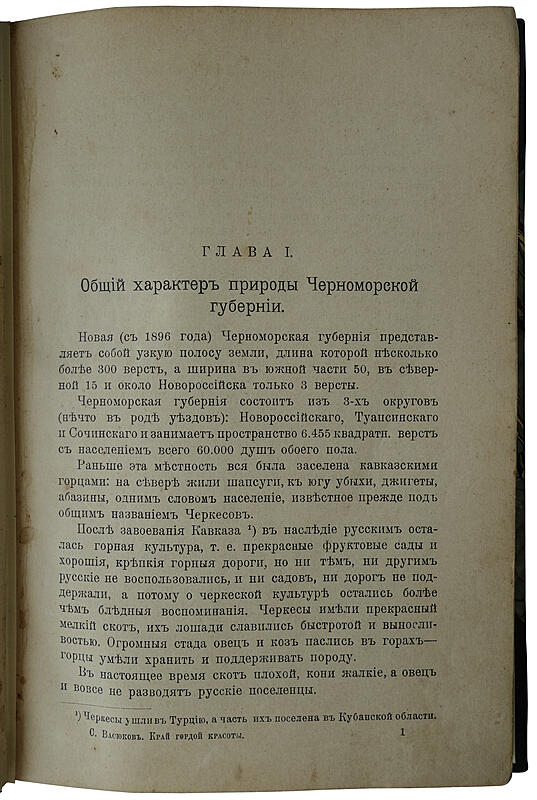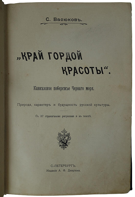 Антикварная книга "Край гордой красоты. Кавказское побережье Черного моря" Васюков С. ОПИСАНИЕ Природа, характер и будущность русской культуры. С 37 страничными рисунками и в тексте. С картой Кавказского побережья Черного моря. Подробно рассмотрены населенные пункты от Новороссийска до Адлера, побережье Абхазии, Поти и Батум, природные достопримечательности побережья. Автор даёт общую характеристику губернии. Далее каждая глава посвящена определенному населённому пункту: описаны его история, условия жизни и природа. Текст легко написан и дополнен фотографиями, снабжёнными подписями. Семён Иванович Васюков (1854–1908) публиковался в «Наблюдателе», «Русских ведомостях», «Вестнике Европы». В последние годы жизни работал в «Новом времени», где впервые и появились его заметки о Черноморском побережье. Впоследствии заметки были изданы в виде книг.