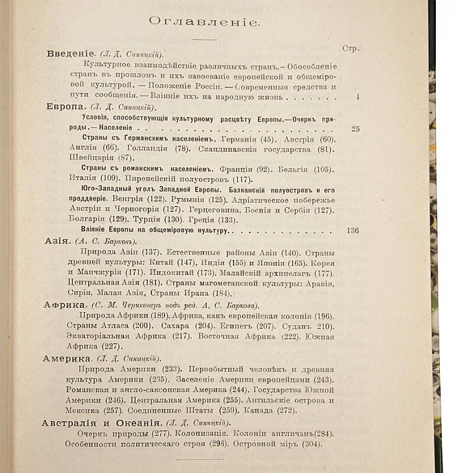 Очерки географии (Антикварная книга 1909 г. в двух частях в одном переплёте) ОПИСАНИЕ А.С. Баркова, С.Г. Григорьева, пр-доц. А.А. Крубера, Л.Д. Синицкого и др. Ч. 1: Европа, Азия, Африка, Америка и Австралия. [2], 308 с., ил.Ч. 2: Европейская и Азиатская Россия. VIII, 391 с., ил. Сборник состоит из статей, написанных разными авторами, и даёт полное и цельное представление о географии России. В нём изложены наиболее существенные данные по предмету. Книга будет полезна для всех лиц, которые пожелают расширить свои географические познания. Первая часть сборника посвящена географии Европы, Азии, Африки, Америки, Австралии и Океании. В очерках освещается природные условия континентов в целом, географическое и экономическое положение, состав населения отдельных стран. Также приведены очерки о колонизации отдельных стран. Вторая часть книги посвящена европейской и азиатской частям России. Во второй части также освещены природные и климатические условия, численность и состав населения, экономика и хозяйство российских регионов.