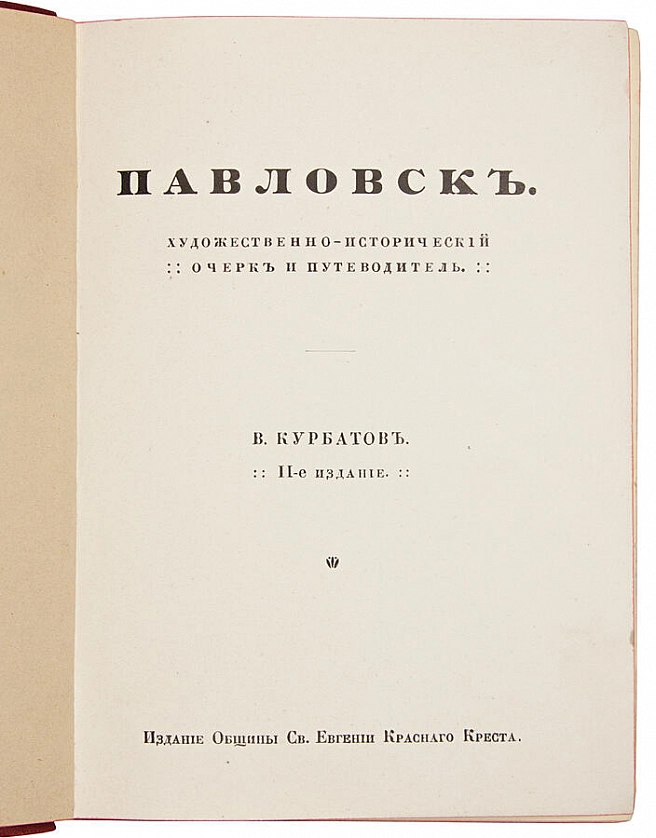 Антикварная книга "Павловск: Художественно-исторический очерк и путеводитель" Курбатов В. 1912г. ОПИСАНИЕ Книга историка архитектуры, одного из основателей Музея Старого Петербурга, профессора Владимира Яковлевича Курбатова (1878–1957). Второе издание книги значительно исправлено и дополнено. Около 150 иллюстраций с видами дворца, парка, павильонов, а также оригинальных чертежей великих зодчих, создавших Павловск. Приложения: портрет Императрицы Марии Федоровны работы Рослена, ее парадная постель, Храм Дружбы, декорации Гонзаго, на двойном листе общий вид дворца и проект обстройки деревни Глазово. Также очень часто утраченный в этом издание на отдельном листе – «План Павловска, с объяснением цифр на плане»