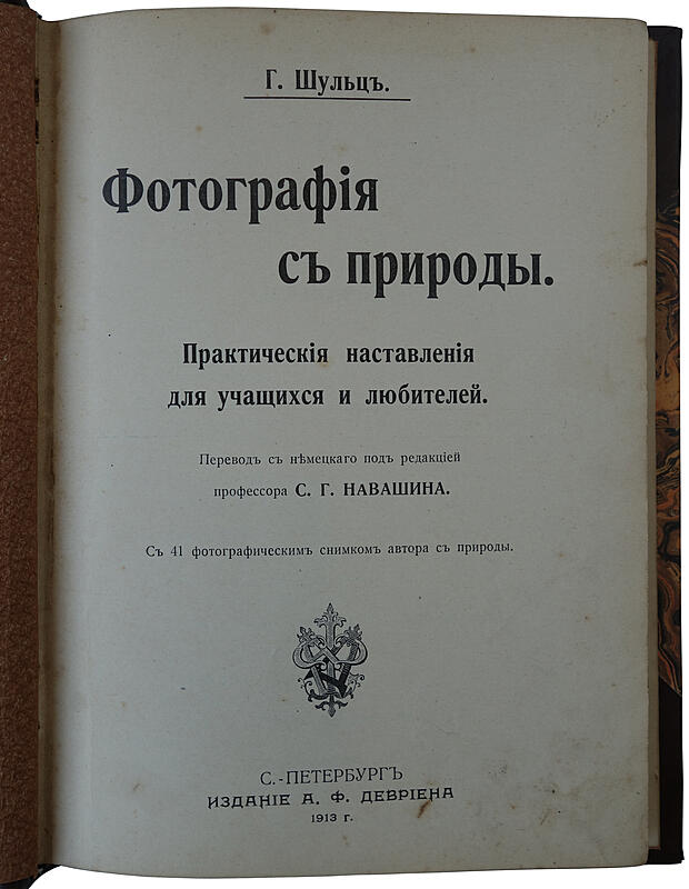Антикварная книга "Фотография с природы" Шульц Г. 1913г. ОПИСАНИЕ Практические наставления для учащихся и любителей. Перевод с немецкого под редакцией профессора С.Г. Навашина. С 41 фотографическим снимком автора с природы. В книге описывается как теоретическая часть (Снаряжение фотографирующего природу, различные вспомогательные средства, основания фотографической техники), так и практическая часть (Географические съемки, ботанические съемки, зоологические съемки).