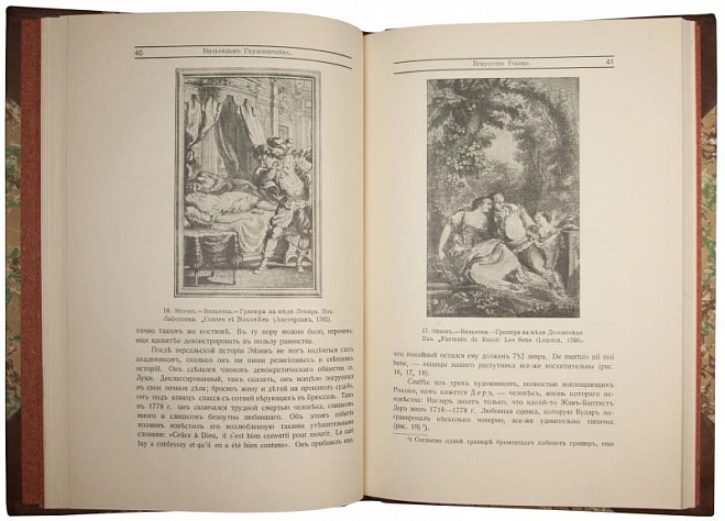 Д-р В. Гаузенштейн. Искусство Рококо (Антикварная книга 1914г.) ОПИСАНИЕ Французские и немецкие иллюстраторы восемнадцатого столетия. С 90 иллюстрациями с гравюр на меди, офортов и рисунков. Рококо – стиль в искусстве и архитектуре, зародившийся во Франции в начале XVIII века и распространившийся вскоре затем в Европе. Отличается грациозностью, легкостью, интимно-кокетливым характером. Для живописи и графики характерны эротические, эротико-мифологические и пасторальные сюжеты. Стиль рококо был очень популярен во Франции и других странах Центральной Европы вплоть до конца XVIII века. В данном издании рассматривается история графики вышеуказанной эпохи, в том числе история книжной иллюстрации, а также приводятся биографические сведения о самих художниках. Книга содержит множество иллюстраций и является ценным трудом по истории культуры.