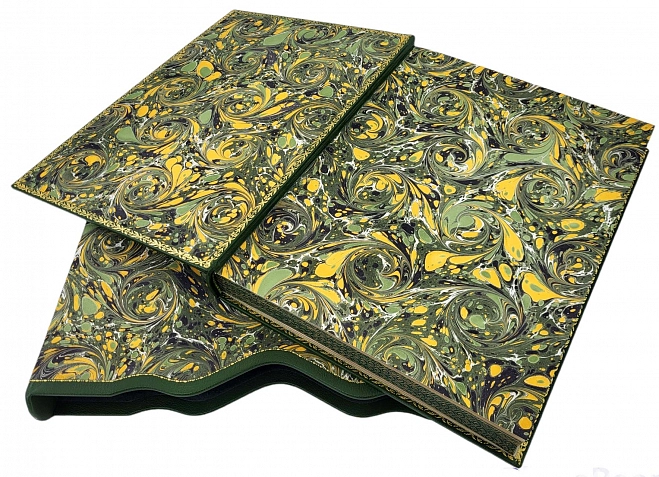 Обрезы окрашены и гравированы вручную, с трёх сторон.