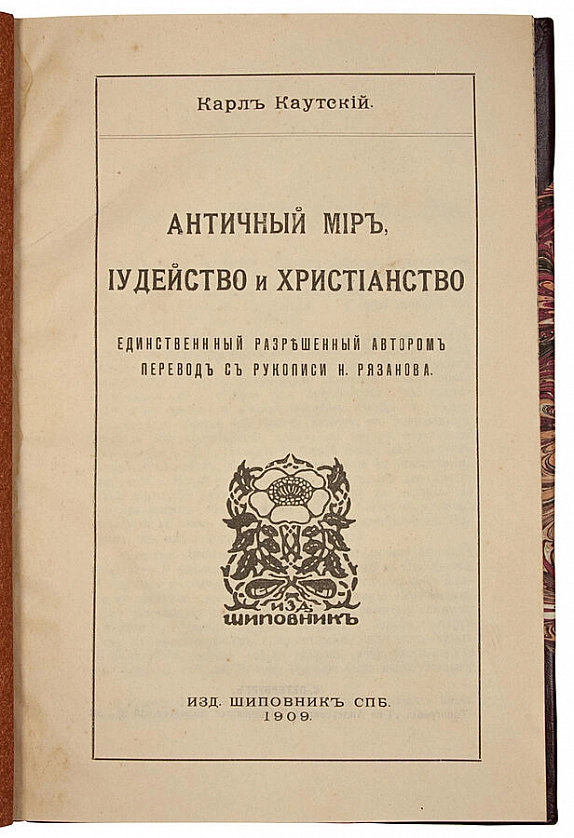 Каутский К. Античный мир, иудейство и христианство (Антикварная книга 1909г.) ОПИСАНИЕ Единственный разрешенный автором перевод с рукописи Н. Рязанова. Эта книга впервые была издана в Германии в 1908 г., а уже в 1909 она была опубликована в России на русском языке. На языке оригинала книга носила название «Происхождение христианства». В своей работе известный теоретик социал-демократии Карл Каутский (1854-1938) основное внимание уделяет социальным предпосылкам возникновения христианства. Он анализирует экономические, политические и духовные предпосылки, вызвавшие потребность в новой религии. Прижизненное издание. Первое издание книги на русском языке.