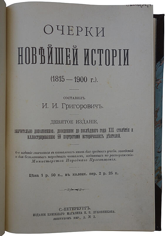 Девятое издание, значительно дополненное, доведенное до последнего года XIX столетия и иллюстрированное 59 портретами исторических деятелей. Григорович Иван Иванович (1833 — 1904) - Инспектор Петербургского коммерческого училища с 1894 до 1904 г. Специалист в области новейшей истории, политической истории.