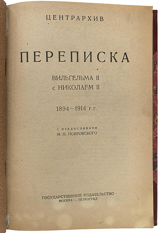 Антикварная книга "Переписка Вильгельма II с Николаем II" ОПИСАНИЕ С предисловием М.Н. Покровского. Переписка императора Николая II и Вильгельма II печатается в русском переводе с английских подлинников и собственноручных копий, хранившихся в Госархиве РСФСР. С предисловием М.Н. Покровского. В приложении алфавитный именной указатель, факсимиле некоторых писем и справочник политических событий, упоминаемых в переписке. Говорить о значении переписки как исторического источника не приходится. Для изучающего международные отношения конца XIX — начала XX века — это документ первостепенной важности. Наибольшую ценность в этом отношении представляют более ранние письма — до 1907 года. Тут мы воочию видим, как глубоко уходят в прошлое корни мировой войны 1914 года.