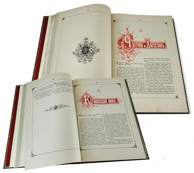 КАВКАЗ И ЗАКАВКАЗЬЕ. АКТЫ, СОБРАННЫЕ КАВКАЗСКОЙ АРХЕОГРАФИЧЕСКОЙ КОМИССИЕЙ (ТОМА 7 (1-2), 8 (1-2), 9 (Ч.1), 10 (Ч.2), 11 (Ч.1), 12 (1-2) ВСЕГО 9 КНИГ (РЕДКОСТЬ! 1866-1904) АННОТАЦИЯ Книга "Кавказ и Закавказье" является сборником актов, собранных Кавказской археографической комиссией. Книга содержит документы, относящиеся к истории и культуре Кавказа и Закавказья. В этой книге представлены различные исторические документы, архивные материалы, дипломатические письма, записи и другие источники, которые позволяют воссоздать исторические события, обычаи и традиции этого региона. ОФОРМЛЕНИЕ Эксклюзивные переплеты из натуральной кожи, с инкрустацией. Ручная работа. Блоки в идеальном состоянии. Книги представляют собой библиографическую редкость и являются ценнейшим источником по истории Кавказа. Значительная часть документов, опубликованных в Актах, была после этого за ненадобностью уничтожена. Тираж издания неизвестен, но, судя по редкости, тираж не мог превышать 50 экз. Особенности переплета: • Эксклюзивный французский переплёт на шнурах; • Переплетная крышка из натуральной, застаренной кожи; • Обложка и корешок украшены художественным многоцветным тиснением и сложной инкрустацией с использованием шагреневой кожи; • Обрез блока окрашен вручную в 2 цвета и украшен ручной гравировкой; • Дублюра окатана вручную 22-х каратным золотом; • Для книг изготовлены индивидуальные футляры с кожаной окантовкой