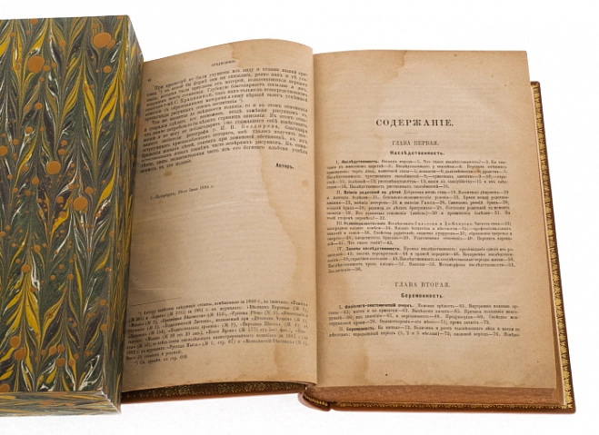 Книга антикварная в библиофильском кожаном переплете "Мать и дитя" Жук В.Н. 1885г. АННОТАЦИЯ Владимир Николаевич Жук (1847-1915 гг.) — известный в дореволюционной России врач и просветитель. Его книга «Мать и дитя» стала первой работой, посвященной гигиене в процессе беременности, родов и ухода за младенцами, целиком основанной на научных знаниях. Материал расположен в разделах, логично следующих друг за другом: наследственность, беременность, жизнь утробного младенца, уход за новорожденным, уход за родильницею, одежда грудных детей, детские принадлежности, мать и кормилица, искусственное вскармливание, первые годы жизни. Огромное значение книги в том, что сложные научно-медицинские данные об особенностях развития организма утробного и новорожденного младенца, а также о функциях материнского организма в периоды вынашивания и вскармливания, поданы в обобщенном и доступном для широкого читателя виде. Автор при помощи многочисленных иллюстраций и комментариев показывает их практические следствия. Содержание: Наследственность. Беременность. Жизнь утробного младенца. Уход за новорожденным. Уход за родильницею. Одежда грудных детей. Детская и ее принадлежности. Мать и кормилица. Искусственное вскармливание. Первые годы жизни. С многими иллюстрациями в тексте. ОПИСАНИЕ Состояние:сохранность очень хорошая. Сохранена мягкая издательская обложка. Утрачен титульный лист. Следы от влаги на бумаге. Исполнение:цельнокожаный переплет изготовлен из натуральной, шагреневой кожи. Блок сшит вручную, на шнуры, по старинной европейской технологии (т.н. французский переплет). Художественное тиснение, элементы ручной росписи. Верхняя крышка переплета и корешок декорированы вставками в технике инкрустации. Корешок украшен бинтами. Форзац из бумаги ручного крашения. Дублюра окатана вручную. Обрезы окрашены и гравированы золотистым орнаментом. Каптал ручного плетения. Для книги изготовлен фигурный футляр с кожаной окантовкой. Эксклюзивное исполнение переплета.
