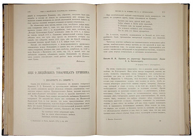 Грот Я. Пушкин, его лицейские товарищи и наставники (Антикварная книга 1899г.) ОПИСАНИЕ Грот Я. Пушкин, его лицейские товарищи и наставники - антикварная книга 1899 года в старинном владельческом переплёте. Статьи и материалы Я. Грота. Издание второе, дополненное, с приложением неизданного письма Пушкина, под редакцией проф. К.Я. Грота. Яков Карлович Грот (1812–1893) - языковед, историк литературы, переводчик. В 1853-1862 годах Яков Карлович – профессор Царскосельского Александровского лицея. Он был учителем и воспитателем великих князей – Николая Александровича и Александра Александровичей (будущего императора Александра III). Под его руководством обучение царских детей стало планомерным и последовательным. С 1862 года он занимался научной и издательской деятельностью II отделения Академии наук, председателем которого являлся с 1884 года и вице-президентом – с 1889 года. Я. К. Грот – автор исследований о писателях XVIII-нач. XIX вв, в том числе «Пушкин, его лицейские товарищи и наставники» и др.