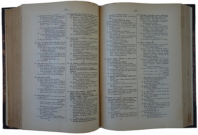 Антикварное издание "Русская мысль и речь. Свое и чужое. Опыт русской фразеологии. Сборник образных слов и иносказаний" Михельсон М.И. 1902-1903гг. (в 2-х томах) ОПИСАНИЕ «Русская мысль и речь» — одна из самых известных книг выдающегося филолога, фольклориста, педагога и писателя, около 20 лет занимавшегося изучением русской фразеологии Морица Ильича Михельсона (1825–1908). Сборник образных слов и иносказаний был удостоен Императорской Академией наук премии Митрополита Макария. Два тома содержат устойчивые фразеологизмы, иносказания, пословицы, поговорки, цитаты, иностранные слова, вошедшие в русский язык. Весь материал приведен в алфавитном порядке с непременным указанием многообразия значений и всевозможных способов применения, проиллюстрированных примерами из литературы и фольклора.