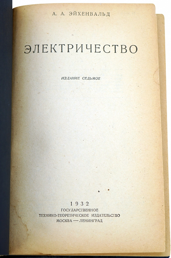 Антикварная книга "Электричество" Эйхенвальд А.А. ОПИСАНИЕ Эйхенвальд А.А. (1863-1944) - выдающийся физик, доктор натуральной философии, директор Московского инженерного училища, экстраординарный профессор Московского университета. Общий характер изложения и в этом издании остался тот же, что и прежде, однако большинство параграфов автором перередактировано вновь и большое число параграфов, а также и рисунков, пришлось прибавить. Часть первая — самая важная — содержит в себе основы учения об электромагнитном поле: главнейшие опытные данные, методы измерений и теорию. Эта часть занимает около половины всей книги. Во второй части изложено учение об электролизе, о газовых разрядах, о радиоактивности и, как обобщение всех этих явлений, учение об электроне. Третья часть заключает в себе учение о переменных токах с их главнейшими техническими применениями, с которыми теперь приходится иметь дело лицам всех специальностей. Затем идет учение об электрических колебаниях и волнах с их применениями к радиотехнике. Последняя глава представляет собою переход от электричества к оптике, в ней изложены экспериментальные и теоретические основы электромагнитной теории света Максвелла, которая представляет собою одно из важнейших завоеваний физики.