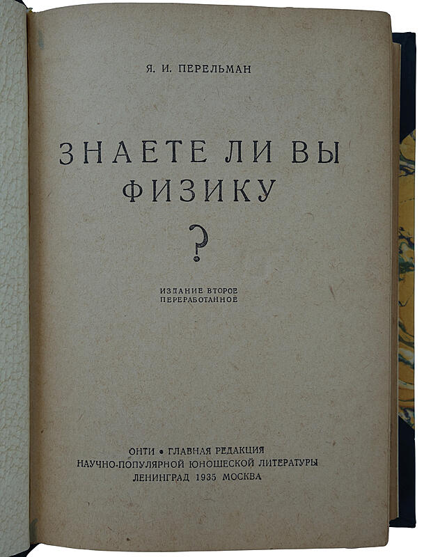 Антикварная книга "Знаете ли вы физику?" Перельман Я.И. Издание ОПИСАНИЕ Издание второе переработанное. Издание представляет собой своеобразную физическую викторину: содержит вопросы и ответы из различных областей физики, которые помогают читателям распознавать различные физические процессы и явления, решать задачки; а также способствует развитию сообразительности, наблюдательности и воображения.