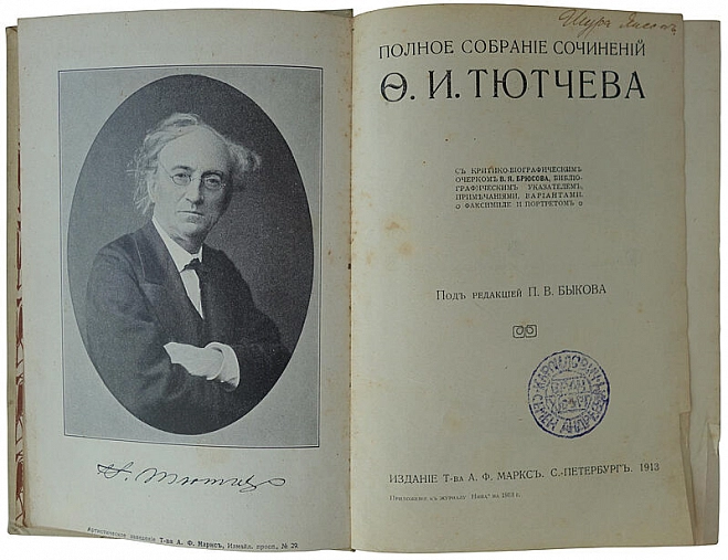 Антикварная книга "Полное собрание сочинений" Тютчев Ф.И. ОПИСАНИЕ С критико-биографическим очерком В.Я. Брюсова, библиографическим указателем, примечаниями, вариантами, факсимиле и портретом. Под редакцией П.В. Быкова. В сборнике представлены все произведения Федора Ивановича Тютчева (1803-1873) - известного русского поэта, одного из самых выдающихся представителей философской и политической лирики. Книга включает разделы: Лирические стихотворения. Политические стихотворения. Французские стихотворения. Переводы и подражания. Политические статьи. Политические статьи в подлиннике. Приложения. Примечания и варианты.