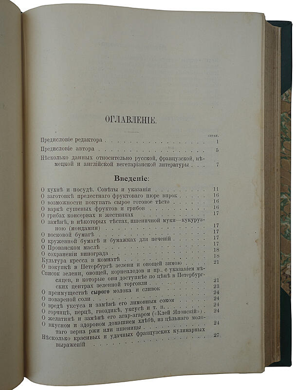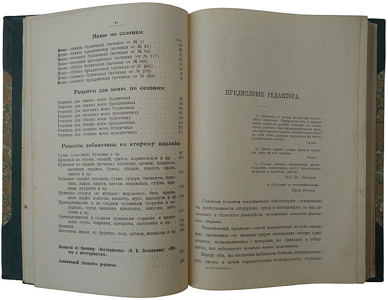 Автор составляет рецепты, и меню с учетом богатства вкусов растительной пищи, их сочетания и раскрытия во время приготовления. За псевдонимом «Вегетарианка» скрывалась О. К. Зеленкова (1845-1921). Уже в конце XIX в. стали появляться теории оздоровления, основанные на приоритете телесной и душевной гармонии, здоровом и правильном питании, труде и активной жизненной позиции.