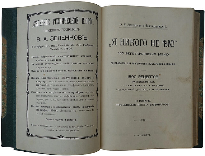 Антикварная книга "Вегетарианка". "Я никого не ем!" 365 вегетарианских меню и руководство для приготовления вегетарианских кушаний Зеленкова О.К 1909г.