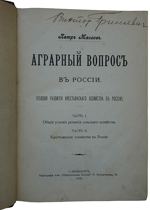 Антикварная книга "Аграрный вопрос в России" Маслов П. ОПИСАНИЕ Условия развития крестьянского хозяйства в России. Часть I. Общие условия развития сельского хозяйства. Часть II. Крестьянское хозяйство в России. Редкое, одно из первых, дореволюционное издание хорошо известной специалистам-экономистам крупной работы по истории аграрного вопроса в России. Автор книги Пётр Павлович Маслов (1867-1946) – российский экономист, академик (с 1929 г.). На протяжении не одного десятка лет труд «Аграрный вопрос в России» был востребованным изучающими сельскохозяйственную экономию, вышло множество переизданий. В книге исследуются вопросы условий развития и упадка производительных сил, связи роста населения и развития народного хозяйства, тема земельной ренты и мн. др.