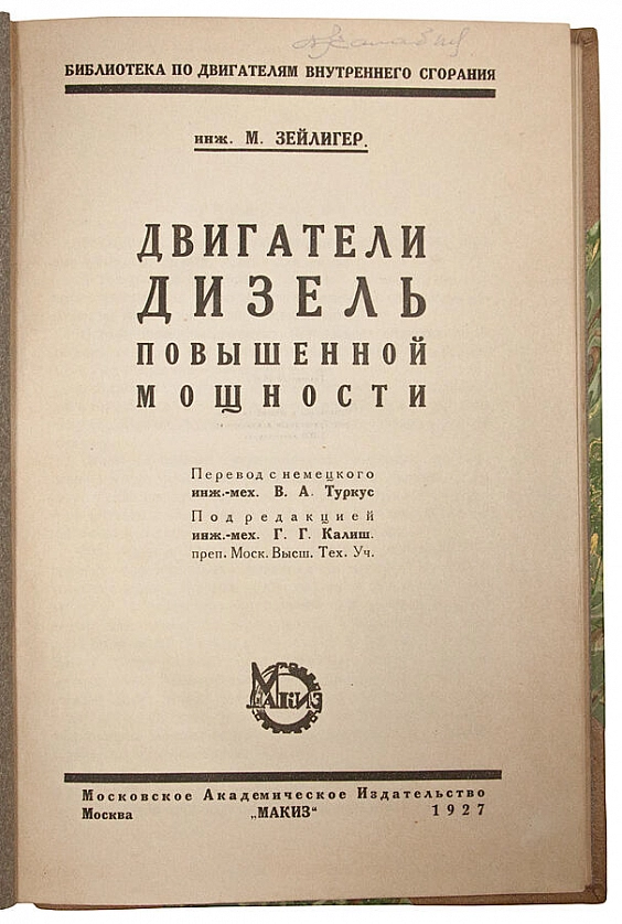 Зейлигер М. Двигатели Дизель повышенной мощности (Антикварная книга 1927г.) ОПИСАНИЕ Библиотека по двигателям внутреннего сгорания. Перевод с немецкого инж.-мех. В.А. Туркус. Под редакцией инж.-мех. Г.Г. Калиш. Преп. Моск. Высш. Тех.Уч. Целью настоящего труда является исследование методов повышения мощности, а так же описание применения высокомощных дизелей на судах и тепловозах.