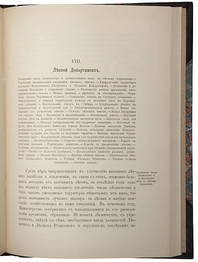 Обзор деятельности министерства земледелия и государственных имуществ за седьмой год его существования (Антикварная книга 1901г.) ОПИСАНИЕ 30 марта 1900-30 марта 1901. Экземпляр экономиста и географа А.Ф. Фортунатова. При учреждении министерств в 1802 году создание отдельного ведомства для надзора за государственными имуществами не предусматривалось. Эти функции распределялись между подразделениями Министерства внутренних дел и Министерства финансов. С 1811 года управлением государственными имуществами занимался Департамент государственных имуществ Министерства финансов, затем (с 29.04.1836) — V отделение Собственной Его Императорского Величества канцелярии. Министерство государственных имуществ было учреждено 26 декабря 1837 (7 января 1838) года. В 1843 году в состав Министерства перешёл из финансового ведомства Лесной департамент вместе с Корпусом Лесничих. В 1845 году 3-й департамент министерства был преобразован в Департамент сельского хозяйства. В 1848—1856 и 1875—1881 гг. в ведении министерства находилось Государственное коннозаводство. В декабре 1866 года состоялось кардинальное преобразование внутренней структуры министерства: был упразднён 1-й департамент; 2-й департамент преобразован во Временный отдел, который, несмотря на своё название, в течение 15 лет был главным подразделением министерства; департамент сельского хозяйства был переименован в департамент земледелия и сельской промышленности. В ноябре 1892 года были образованы два новых отделения: инородческое и сибирское. С 1873 по 1905 год в состав министерства входил Горный департамент, ранее находившийся в финансовом ведомстве. В 1894 году ведомство было преобразовано в Министерство земледелия и государственных имуществ и главным для министерство стали вопросы сельского хозяйства, а управление государственными имуществами: земельными, лесными и горными, отошло на второй план. В мае 1905 года оно снова меняет профиль и статус — реорганизуется в Главное управление землеустройства и земледелия, в котором сосредоточилось осуществление столыпинских аграрных реформ. В октябре 1915 года Главное управление вновь преобразуется в Министерство земледелия. Министерству государственных имуществ вверялось управление государственными имуществами (казёнными землями, казёнными оброчными статьями, лесами казённого ведомства), общий надзор за исполнением повелений о сбережении лесов и поощрении лесоразведения, заведование горной и соляной частями, охранение источников минеральных вод и заведование Кавказскими минеральными водами, заведование кустарными промыслами, попечение над некоторыми категориями населения, организация управления крестьянами, которое повысило бы их благосостояние. Министр земледелия и государственных имуществ являлся одновременно и главноуправляющим горною частью, которой он заведовал посредством Горного Департамента, высшего горного учреждения — Горного Совета, Горного Ученого Комитета и местных горных установлений.