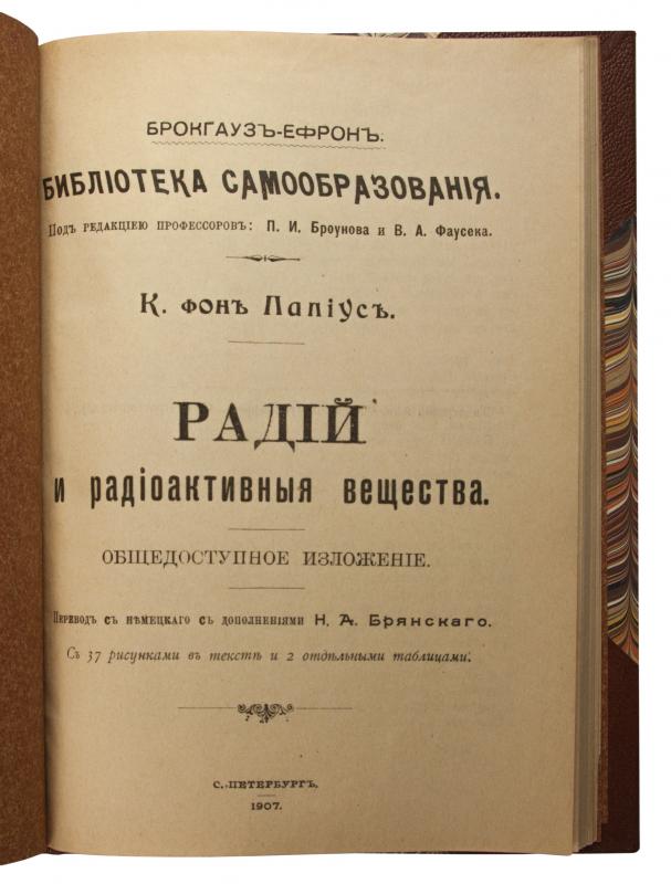 Радий и радиоактивные вещества (Антикварная книга 1907г.) ОПИСАНИЕ Антикварное издание. Общедоступное изложение. Перевод с немецкого с дополнениями Н.А. Брянского. С 37 рисунками в тексте и 2 отдельными таблицами. Вскоре после того, как супруги Пьер и Мария Кюри в 1898 году открыли радий, необычные свойства этого радиоактивного элемента вызвали настоящий ажиотаж у публики. И множество предпринимателей, несмотря на предупреждения ученых, использовали радий для продвижения своих товаров. В Англии его даже добавляли в шоколад. А в России с 1907 года использовали для лечения облысения. Если тонкую целлулоидную или каучуковую капсюльку с очень активною солью радия положить на кожу и продержать на ней некоторое время, то на коже обнаружится краснота, причем она появится или тотчас же, или по истечении некоторого промежутка времени, который тем меньше, чем сильнее действие радия. Это красное пятно появится как раз там, где действовал радий. Местное изменение кожи имеет вид ожога. Иногда образуется волдырь. Если действие радия было довольно продолжительно, то получается ранка, которую очень трудно заживить. В одном опыте Кюри (Пьер Кюри.— "История") действовал на свою руку относительно малоактивным препаратом в течение 10 часов. Сперва образовалась краснота, а затем язвочка, начавшая проходить через 4 месяца. Кожа подверглась местному разрушению и выздоровела лишь по истечении довольно продолжительного времени, причем на ней остался весьма заметный рубец. При получасовой экспозиции радия на коже получился через две недели ожог, который перешел затем в волдырь, потребовавший двухнедельного же лечения. Другой ожог, получившийся от 8-минутной экспозиции, выразился в виде красного пятна, появившегося только через два месяца, и был незначителен...