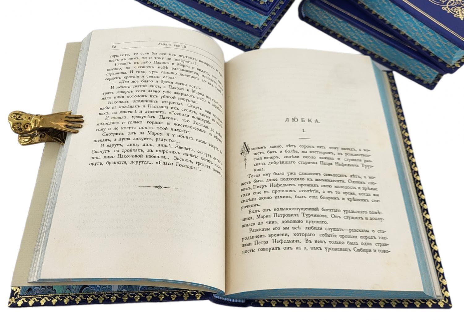 Для книг изготовлены библиофильские цельнокожаные переплеты из натуральной, шагреневой кожи. Блоки перешиты вручную, на шнуры. Форзацы из мраморной бумаги, по периметру окатаны вручную золотистым бордюрным орнаментом. Обрезы окрашены, а затем отгравированы вручную. Художественное тиснение обложки и корешков, в том числе ручное. Фигурный футляр с вырезом, с кожаной окантовкой и ручной накаткой орнамента. Эксклюзивное исполнение.