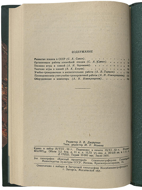 Антикварная книга "Хоккей с шайбой" ОПИСАНИЕ В.К. Егоров, А.Н. Новокрещенов, С.А. Савин, А.В. Тарасов, А.И. Чернышев. Под общей редакцией С.А. Савина Учебное пособие для секций коллективов физической культуры. Издание книги «Хоккей с шайбой» представляет собой учебное пособие для спортивных секций, выпущенное в 1953 году. Книга предназначалась для инструкторов и тренеров, работавших с хоккейными коллективами, а при ее создании авторы руководствовались передовым опытом тренерской работы с ведущими хоккейными командами СССР.