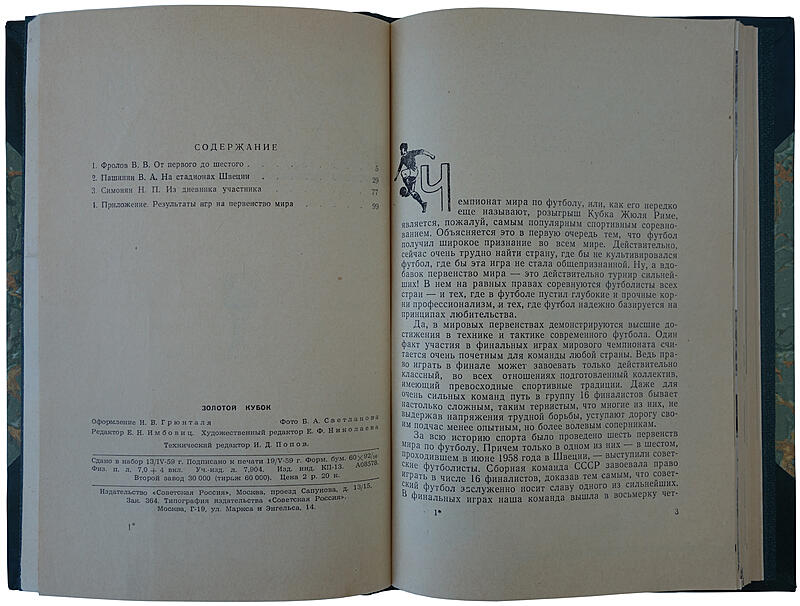Антикварная книга "Золотой кубок" ОПИСАНИЕ Оформление И.В. Грюнталя. Фото Б.А. Светланова. Редактор Е.Н. Имбовиц. Художественный редактор Е.Ф. Николаева. Технический редактор И.Д. Попов. В данной книге рассказывается о шести футбольных первенствах мира. Причём только в одном из них - в шестом, проходившем в июне 1958 года в Швеции, - выступали советские футболисты. Наибольшее внимание уделено последнему чемпионату и прежде всего играм команды СССР. В конце книги читатель найдет технические результаты всех шести первенств мира. СОДЕРЖАНИЕ Фролов В.В. От первого до шестого Пашинин В.А. На стадионах Швеции Симонян Н.П. Из дневника участника Приложение. Результаты игр на первенство мира
