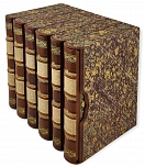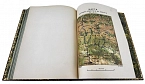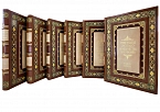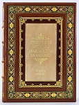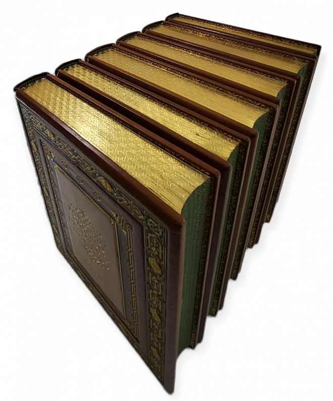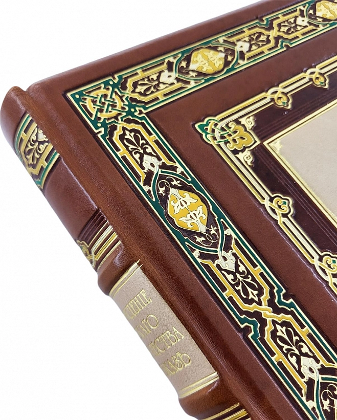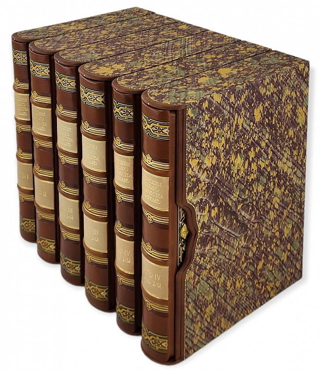Подарочный, французский переплет из натуральной кожи. Блоки перешиты вручную, на шнуры. Обрезы окрашены и гравированы вручную. Форзацы из мраморной бумаги ручного крашения, бордюрный орнамент накатан вручную. На обложке и корешке вставки из шагреневой кожи. Художественное тиснение обложки и корешка, в т.ч. ручное. Элементы ручной росписи по коже. Индивидуальные фигурные футляры с кожаной окантовкой. Эксклюзивное исполнение переплета.