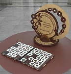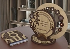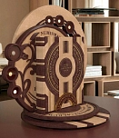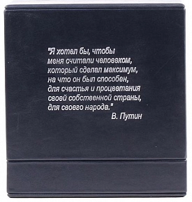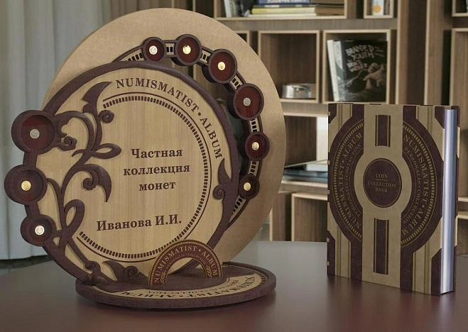 Комбинация натуральных кож «Castagno» и «Vebsalide Terpano». Обложка декорирована глубоким блинтовым и рельефным золотым тиснением. Подставка под альбом в виде монеты достоинством 2 руб. изготовлена из ценных пород дерева, украшена лазерным выжиганием, узорами и вставками из кожи.