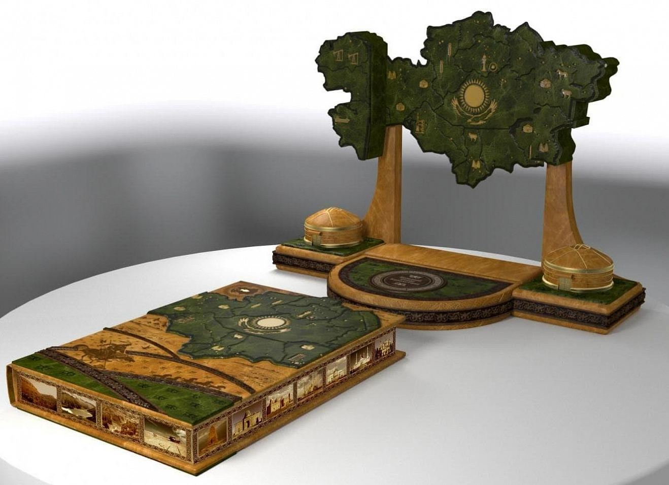 Арт-объект разработан по принципу отдельных модулей, где книга совмещается с подставкой и элементами оформления, образуя с ними единое целое. В основе арт-объекта редкое иллюстрированное издание – «Большой атлас истории и культуры Казахстана».
