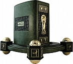 Составной переплет «Брадель», ручной работы, выполнен из комбинации натуральных кож (кожи «Gabinetto Green» и кожи «Perugia Brown» производства итальянской фабрики «Carisma»). Обложки книг оформлены рельефным золотым тиснением, узором «футбольная сетка» выполненным в технике «высокий барельеф», а также декорированы накладными латунными пластинами ручного травления и чернения. Обрезы книг выполнены в уникальной технике художественной запечатки золотой основы. Футляр выполнен в том же стиле,что и книги, декорирован итальянским коттон-бархатом. Декоративные элементы футляра, в виде мячей, выполнены с применением технологии химической металлизации.