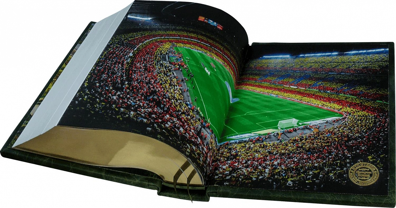 Составной переплет «Брадель», ручной работы, выполнен из комбинации натуральных кож (кожи «Gabinetto Green» и кожи «Perugia Brown» производства итальянской фабрики «Carisma»). Обложки книг оформлены рельефным золотым тиснением, узором «футбольная сетка» выполненным в технике «высокий барельеф», а также декорированы накладными латунными пластинами ручного травления и чернения. Обрезы книг выполнены в уникальной технике художественной запечатки золотой основы. Футляр выполнен в том же стиле,что и книги, декорирован итальянским коттон-бархатом. Декоративные элементы футляра, в виде мячей, выполнены с применением технологии химической металлизации.