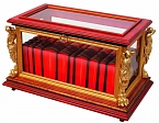 Издания в переплете из натуральной кожи с золотым тиснением, украшенным металлической пластиной в виде замочной скважины. Книги помещены в прозрачный ларец со строгими декоративными элементами.
