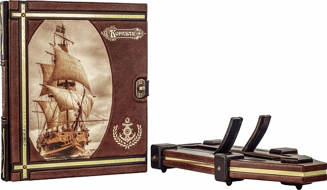 Книга в простом, но оригинальном исполнении. Авторский уникальный дизайн в стиле старинных каравелл. Обложка книги изготовлена вручную в лучших традициях французского составного переплета. Необычный стиль комплекта подчеркнут сочетанием двух типов натуральной кожи «Мarone Zegna» и «Jango» производства итальянской кожевенной фабрики «Carisma», а также украшен репродукцией на холсте. Двухуровневая обложка оформлена рельефным золотым тиснением, хольнитенами цвета «Антик» и оснащена латунной застежкой, формирующей в сознании читателя ритуал открывания и закрывания книги. Образ книги завершает кожаная подставка в форме лодки, выполненная с тем же сочетанием материалов, что и книга.