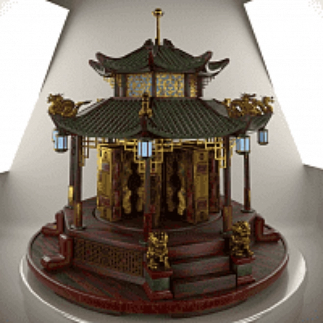 Металлический оклад со сквозной обложкой и вплетенной кожей, фигурная порезка латуни, сложные обрезы книжных блоков – сочетание техник художественной репродукции по золоту и объемной гравировки. Конструкция пагоды выполнена из натурального дуба, частично затянута в кожу, декорирована литыми фигурки с позолотой, оснащена подсветкой и механизмом вращения подиума на сенсорных датчиках.