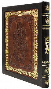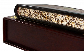 Составной переплет «Брадель», ручной работы,выполнен из комбинации натуральных кож «Robbat Parle» и «Marrone» производства итальянской кожевенной фабрики «Carisma». Двухуровневая обложка книги и подставка оформлена композицией художественного травления латуни. Составной форзац с фотопечатью, на кожаной слизуре. Кожаный каптал и шелковая лента-ляссе. Обрез книги выполнен в уникальной технике позолоты с нанесением художественной репродукции.