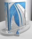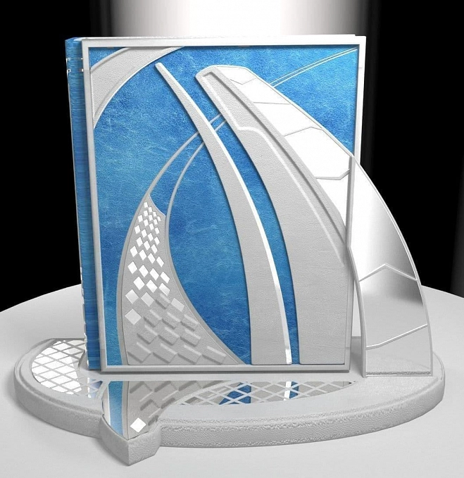 Комбинация натуральных кож «Latte» и «Patina Blue». Обложка со вставками из хромированного металла, декорирована рельефным серебряным тиснением. Обрез книги выполнен в авторской технике серебрения с нанесением репродукций. Подставка из дерева, затянутого в кожу, оформлена в едином стиле с книгой.