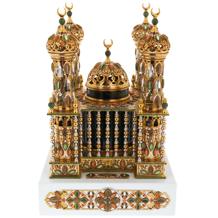 Выполнено в единственном экземпляре! Под заказ возможно индивидуальное изготовление! В каждом доме настоящего правоверного несомненно хранится Священная Книга, несущая в себе основы мусульманской веры и многовековые традиции Ислама. Златоустовские мастера гравюры на металле и уральские камнерезы изготовили удивительное хранилище для Корана, которое станет истинным украшением дома, символизирующим своей красотой и изяществом подлинное почтение к Источнику Веры. Хранилище с большим вкусом и знанием сделано в виде мечети и, как всякое подобное сооружение, имеет собственное имя – «Аль-Маликити Масджид». Архитектурный комплекс «Малахитовая мечеть» полностью оправдывает свое название, так как в отделке щедро использован отполированный малахит, чьи неповторимые симметричные узоры кропотливо составлены мастерами-камнерезами, а глубокий цвет переливами напоминает зеленый бархат или зеленый шелк, развевающийся на ветру, и белоснежный кварц. Малахитовая многоступенчатая центральная часть здания с золочеными просечными окнами и арочными ажурными дверями увенчана позолоченным куполом с включенными в него мерцающими на свету белыми, изумрудными, мятными, рубиновыми и аметистовыми фианитами, ограненными «маркизой». Вокруг нее гордо высятся четыре стройных минарета, включающих в себя все то же изысканное и лаконичное сочетание темно-зеленого малахита и снежно-белого мерцающего кварца, украшенные золоченым кружевом металлических накладок, усыпанных сверкающими ограненными камнями, и увенчанные позолоченными куполами. «Двор» храма с трех сторон обрамляет крытая галерея со множеством изящных колонн, внутри которой лежит роскошная многоцветная эмалевая мозаика, своими сложнейшими узорами напоминающая богатую отделку дворца восточного владыки. Все сооружение, изготовленное из камня и металла, вызывает ощущение легкости и ажурности. В изделии сочетаются строгость линий, изящество и неповторимая роскошь отделки: все металлические детали тщательно отполированы, щедро украшены многими сотнями самоцветов и тонко расписаны разноцветной эмалью: белой, темно-зеленой, сиреневой, мятной, малиновой. И, как во всяком храме, есть здесь свое сакральное, священное место – собственно хранилище. В белоснежной подставке мечети, обрамленной металлическими узорными пластинами, покрытыми самоцветами и многоцветной эмалью, имеется выдвижной ящик, отделанный изнутри бежевой кожей, в котором имеется место для Корана – главной книги Ислама, столь же богато изукрашенной и позолотой, и малахитовыми накладками, и ограненными камнями, и эмалями. Рядом с Кораном находятся изящные, украшенные фианитами четки, выточенные из густо-зеленого малахита, снабженные подвеской с крупным малахитовым кабошоном и золоченой накладкой именем Аллаха. Кроме всего, мастера, изготовившие «Аль-Маликити Масджид», предусмотрели и свет, и звук: разные режимы светодиодного освещения задаются с пульта ДУ, с его же помощью включается запись - призыв муэдзина к молитве. Таким образом, даже в темное время суток мечеть будет не просто необычным и изысканным украшением интерьера, а станет его центром.