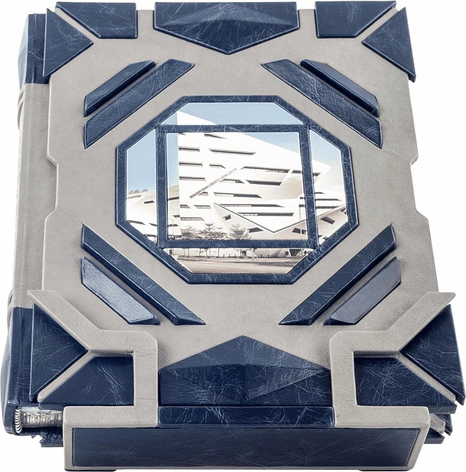 Составной переплет «Брадель» ручной работы, выполнен в комбинации натуральных кож «Foschia» и «Plumbagoblu» производства итальянской кожевенной фабрики «Carisma». Обложка книги двухуровневая, оформлена объемными элементами ручной продавки и рельефным серебряным тиснением, с использованием фольги «Luxor 240», декорирована вставками из холста с художественной фотопечатью. Обрез книги выполнен в уникальной технике серебрения с нанесением репродукций. Подставка уникальной авторской архитектуры выполнена в том же стиле, что и книга, декорирована металлическими спицами, устлана итальянским коттон-бархатом.