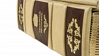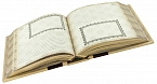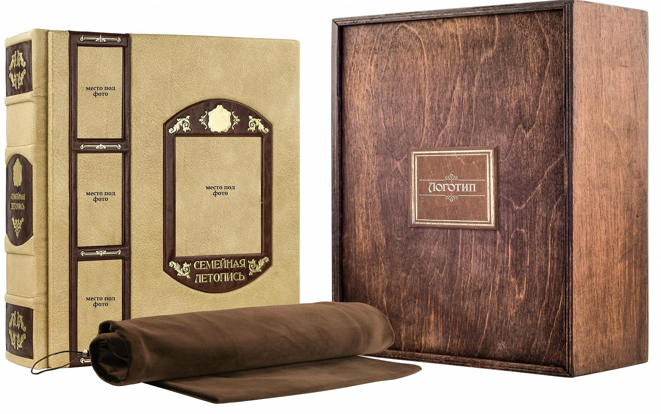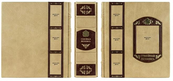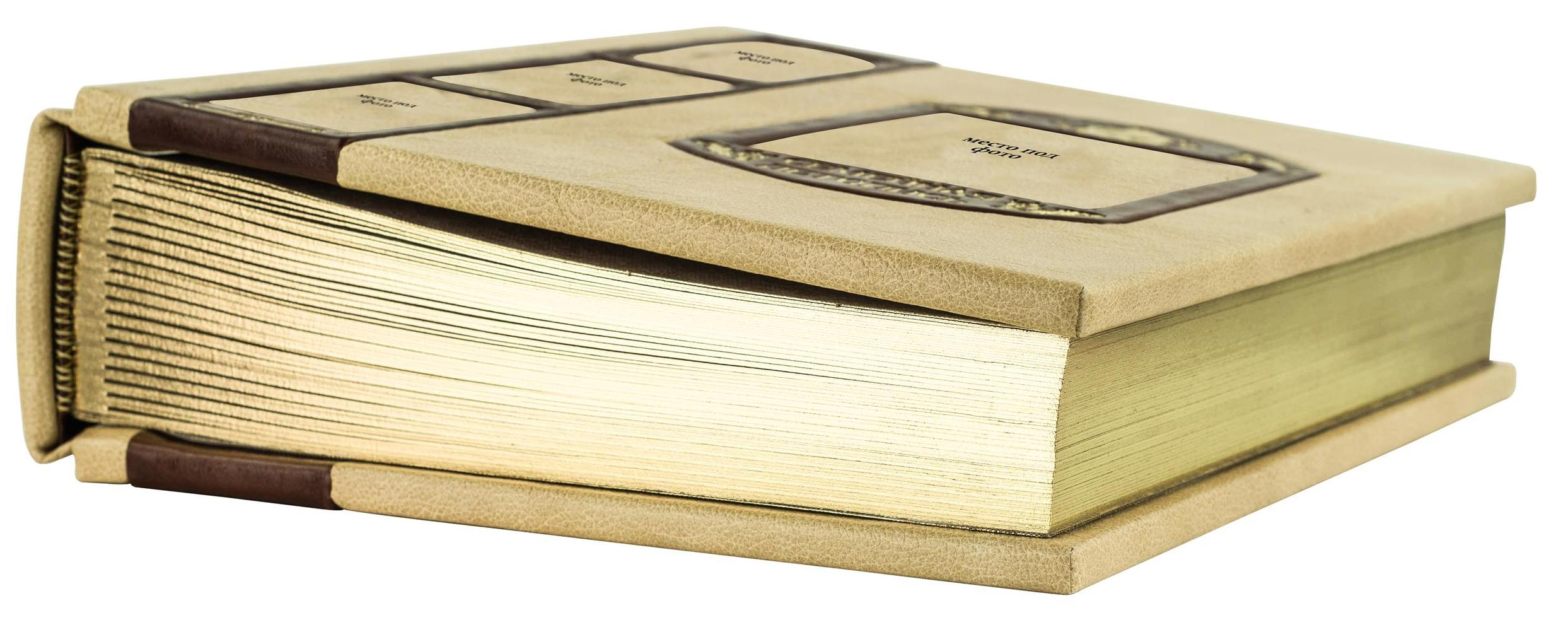 Составной переплет «Брадель» ручной работы, выполнен из натуральной кожи «Marma Parle» производства кожевенной итальянской фабрики «Claudio». Обложка оформлена вставками из холста с художественной фотопечатью и рельефным золотым тиснением, с использованием золотой фольги «Luxor 240». Обрез альбома выполнен в авторской технике золочения «Old gold».