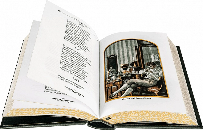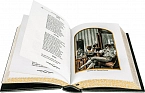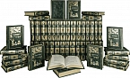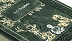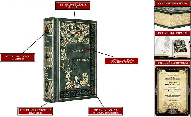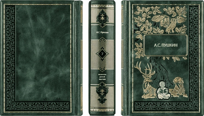 Составной переплет «Брадель» ручной работы, выполнен из натуральной кожи «Scarlett Green» производства итальянской кожевенной фабрики Carisma». Обложки книг оформлены комбинацией многоуровневого объемного тиснения: глубокого блинтового, рельефного золотого и серебряного, c использованием фольги «Luxor 240». Обрезы книг выполнены в уникальной технике позолоты с нанесением орнамента. По желанию клиента на заднюю обложку каждого тома может быть оттеснена семейная монограмма (суперэкслибрис), что переводит собрание в разряд фамильной библиотеки, которая будет передаваться из поколения в поколение.