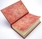 Французский стиль кожаного переплета, полностью ручная работа. Цветное и рельефное тиснение, оформление дизайнерской бумагой форзацев. Книжные блоки отшлифованы вручную, тонированы с нанесением орнамента золотой фольгой.